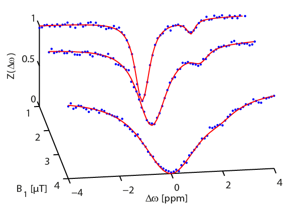 Here you find Z-spectrum simulations in the case of a two and three pool systems under continous wave (cw) irradiation. For a two pool system also the solution for pulsed spinlock irradiation is given.