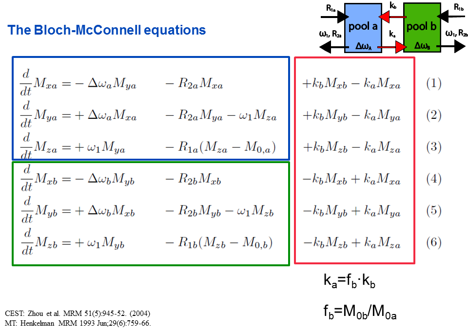 Here you find methods for CEST quantification. This means to achieve access to the CEST pool parameters as defined in the Bloch-McConnell equations such as exchange rate, concentration and transverse relaxation of the CEST site.